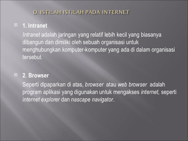 - 10. 1. Intranet Intranet adalah jaringan yang relatif lebih kecil yang biasanya dibangun dan dimiliki oleh sebuah organisasi untuk menghubungkan komputer-komputer yang ada di dalam organisasi tersebut. 2. Browser Seperti dipaparkan di atas, browser atau web browser adalah program aplikasi yang digunakan untuk mengakses internet, seperti internet explorer dan nascape navigator.