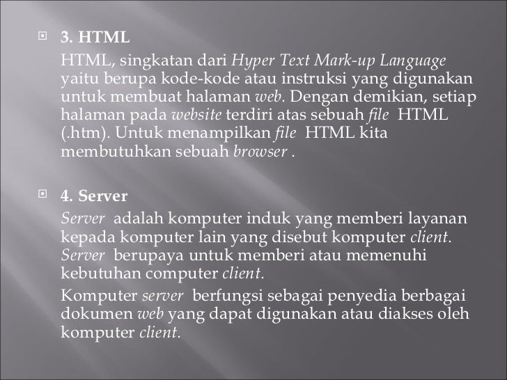 - 11. 3. HTML HTML, singkatan dari Hyper Text Mark-up Language yaitu berupa kode-kode atau instruksi yang digunakan untuk membuat halaman web. Dengan demikian, setiap halaman pada website terdiri atas sebuah file HTML (.htm). Untuk menampilkan file HTML kita membutuhkan sebuah browser . 4. Server Server adalah komputer induk yang memberi layanan kepada komputer lain yang disebut komputer client. Server berupaya untuk memberi atau memenuhi kebutuhan computer client. Komputer server berfungsi sebagai penyedia berbagai dokumen web yang dapat digunakan atau diakses oleh komputer client.