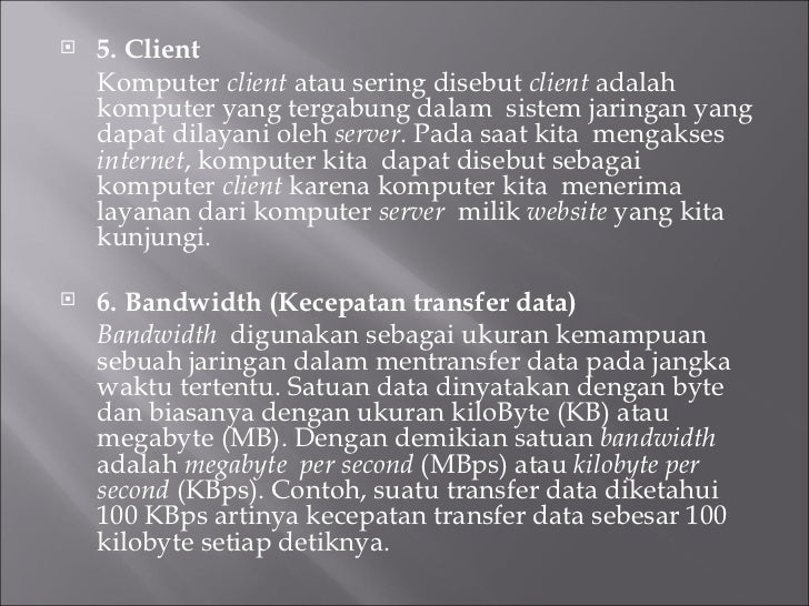 - 12. 5. Client Komputer client atau sering disebut client adalah komputer yang tergabung dalam sistem jaringan yang dapat dilayani oleh server. Pada saat kita mengakses internet, komputer kita dapat disebut sebagai komputer client karena komputer kita menerima layanan dari komputer server milik website yang kita kunjungi. 6. Bandwidth (Kecepatan transfer data) Bandwidth digunakan sebagai ukuran kemampuan sebuah jaringan dalam mentransfer data pada jangka waktu tertentu. Satuan data dinyatakan dengan byte dan biasanya dengan ukuran kiloByte (KB) atau megabyte (MB). Dengan demikian satuan bandwidth adalah megabyte per second (MBps) atau kilobyte per second (KBps). Contoh, suatu transfer data diketahui 100 KBps artinya kecepatan transfer data sebesar 100 kilobyte setiap detiknya.