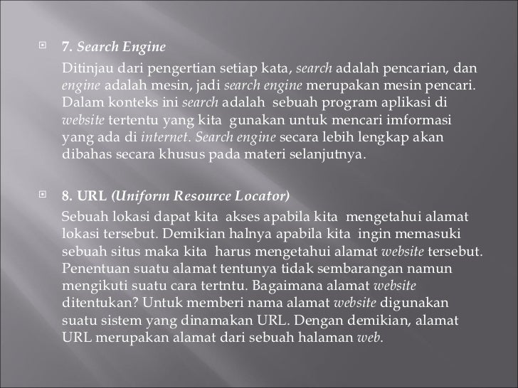- 13. 7. Search Engine Ditinjau dari pengertian setiap kata, search adalah pencarian, dan engine adalah mesin, jadi search engine merupakan mesin pencari. Dalam konteks ini search adalah sebuah program aplikasi di website tertentu yang kita gunakan untuk mencari imformasi yang ada di internet. Search engine secara lebih lengkap akan dibahas secara khusus pada materi selanjutnya. 8. URL (Uniform Resource Locator) Sebuah lokasi dapat kita akses apabila kita mengetahui alamat lokasi tersebut. Demikian halnya apabila kita ingin memasuki sebuah situs maka kita harus mengetahui alamat website tersebut. Penentuan suatu alamat tentunya tidak sembarangan namun mengikuti suatu cara tertntu. Bagaimana alamat website ditentukan? Untuk memberi nama alamat website digunakan suatu sistem yang dinamakan URL. Dengan demikian, alamat URL merupakan alamat dari sebuah halaman web.