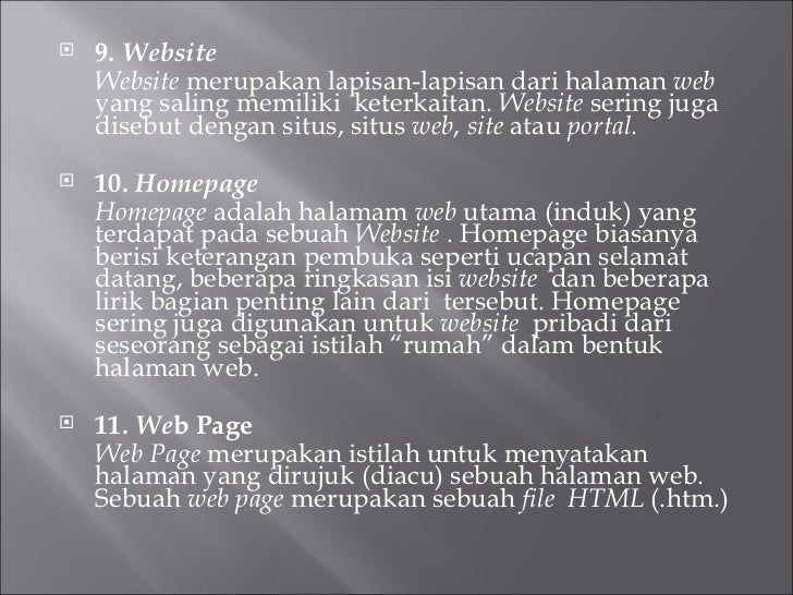 - 14. 9. Website Website merupakan lapisan-lapisan dari halaman web yang saling memiliki keterkaitan. Website sering juga disebut dengan situs, situs web, site atau portal. 10. Homepage Homepage adalah halamam web utama (induk) yang terdapat pada sebuah Website . Homepage biasanya berisi keterangan pembuka seperti ucapan selamat datang, beberapa ringkasan isi website dan beberapa lirik bagian penting lain dari tersebut. Homepage sering juga digunakan untuk website pribadi dari seseorang sebagai istilah “rumah” dalam bentuk halaman web. 11. Web Page Web Page merupakan istilah untuk menyatakan halaman yang dirujuk (diacu) sebuah halaman web. Sebuah web page merupakan sebuah file HTML (.htm.)