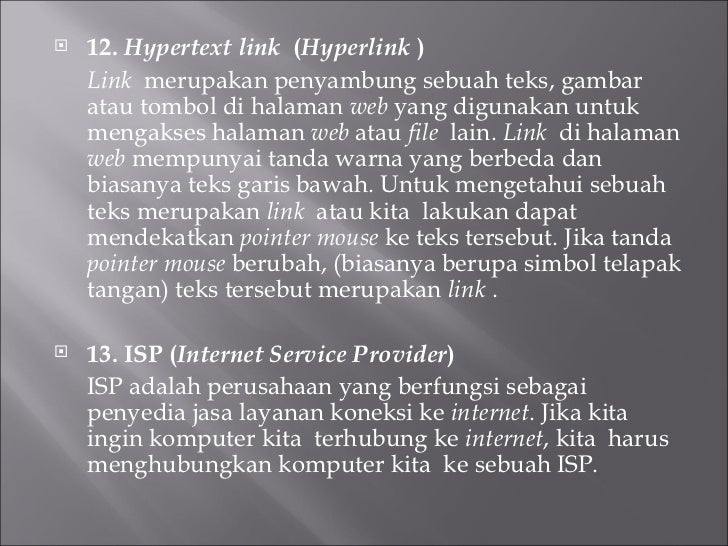 - 15. 12. Hypertext link (Hyperlink ) Link merupakan penyambung sebuah teks, gambar atau tombol di halaman web yang digunakan untuk mengakses halaman web atau file lain. Link di halaman web mempunyai tanda warna yang berbeda dan biasanya teks garis bawah. Untuk mengetahui sebuah teks merupakan link atau kita lakukan dapat mendekatkan pointer mouse ke teks tersebut. Jika tanda pointer mouse berubah, (biasanya berupa simbol telapak tangan) teks tersebut merupakan link . 13. ISP (Internet Service Provider) ISP adalah perusahaan yang berfungsi sebagai penyedia jasa layanan koneksi ke internet. Jika kita ingin komputer kita terhubung ke internet, kita harus menghubungkan komputer kita ke sebuah ISP.