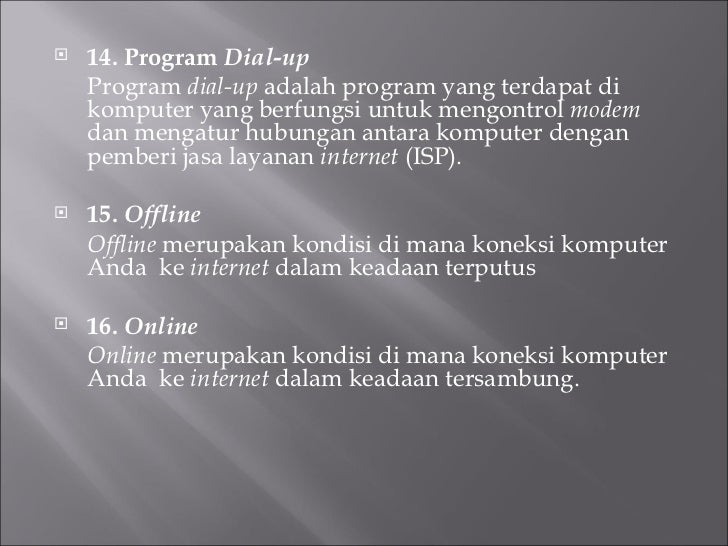- 16. 14. Program Dial-up Program dial-up adalah program yang terdapat di komputer yang berfungsi untuk mengontrol modem dan mengatur hubungan antara komputer dengan pemberi jasa layanan internet (ISP). 15. Offline Offline merupakan kondisi di mana koneksi komputer Anda ke internet dalam keadaan terputus 16. Online Online merupakan kondisi di mana koneksi komputer Anda ke internet dalam keadaan tersambung.