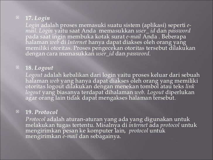 - 17. 17. Login Login adalah proses memasuki suatu sistem (aplikasi) seperti e- mail. Login yaitu saat Anda memasukkan user_ id dan password pada saat ingin membuka kotak surat e-mail Anda . Beberapa halaman web di Internet hanya dapat diakses oleh orang yang memiliki otoritas. Proses pengecekan otoritas tersebut dilakukan dengan cara memasukkan user_id dan password. 18. Logout Logout adalah kebalikan dari login yaitu proses keluar dari sebuah halaman web yang hanya dapat diakses oleh orang yang memiliki otoritas logout dilakukan dengan menekan tombol atau teks link logout yang biasanya terdapat dihalaman web. Logout diperlukan agar orang lain tidak dapat mengakses halaman tersebut. 19. Protocol Protocol adalah aturan-aturan yang ada yang digunakan untuk melakukan tugas tertentu. Misalnya di internet ada protocol untuk mengirimkan pesan ke komputer lain, protocol untuk mengirimkan e-mail dan sebagainya.