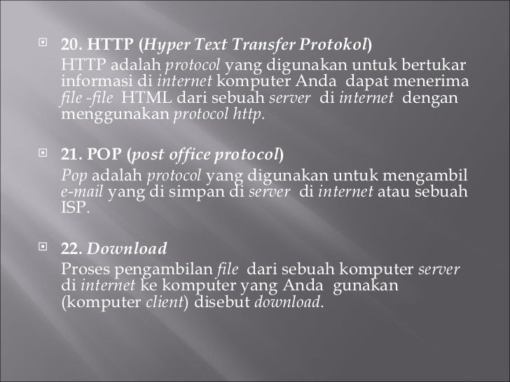 - 18. 20. HTTP (Hyper Text Transfer Protokol) HTTP adalah protocol yang digunakan untuk bertukar informasi di internet komputer Anda dapat menerima file -file HTML dari sebuah server di internet dengan menggunakan protocol http. 21. POP (post office protocol) Pop adalah protocol yang digunakan untuk mengambil e-mail yang di simpan di server di internet atau sebuah ISP. 22. Download Proses pengambilan file dari sebuah komputer server di internet ke komputer yang Anda gunakan (komputer client) disebut download.