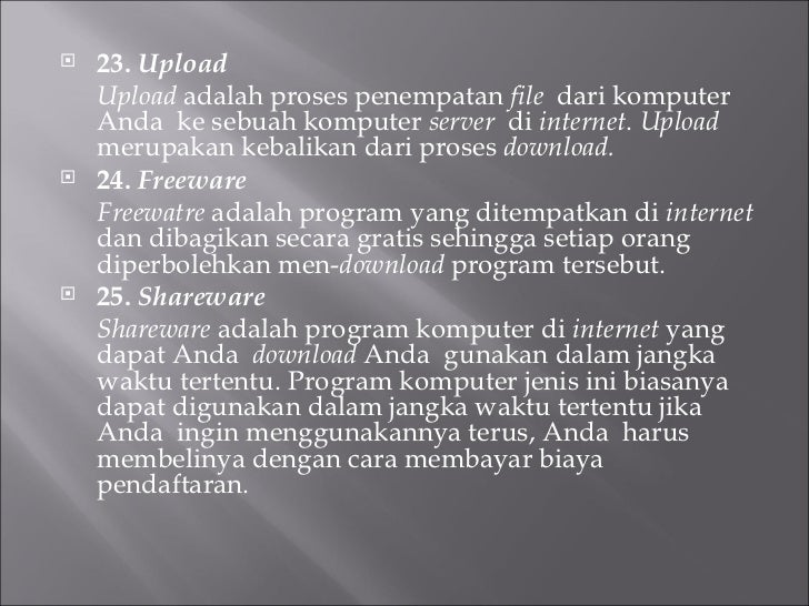 - 19. 23. Upload Upload adalah proses penempatan file dari komputer Anda ke sebuah komputer server di internet. Upload merupakan kebalikan dari proses download. 24. Freeware Freewatre adalah program yang ditempatkan di internet dan dibagikan secara gratis sehingga setiap orang diperbolehkan men-download program tersebut. 25. Shareware Shareware adalah program komputer di internet yang dapat Anda download Anda gunakan dalam jangka waktu tertentu. Program komputer jenis ini biasanya dapat digunakan dalam jangka waktu tertentu jika Anda ingin menggunakannya terus, Anda harus membelinya dengan cara membayar biaya pendaftaran.