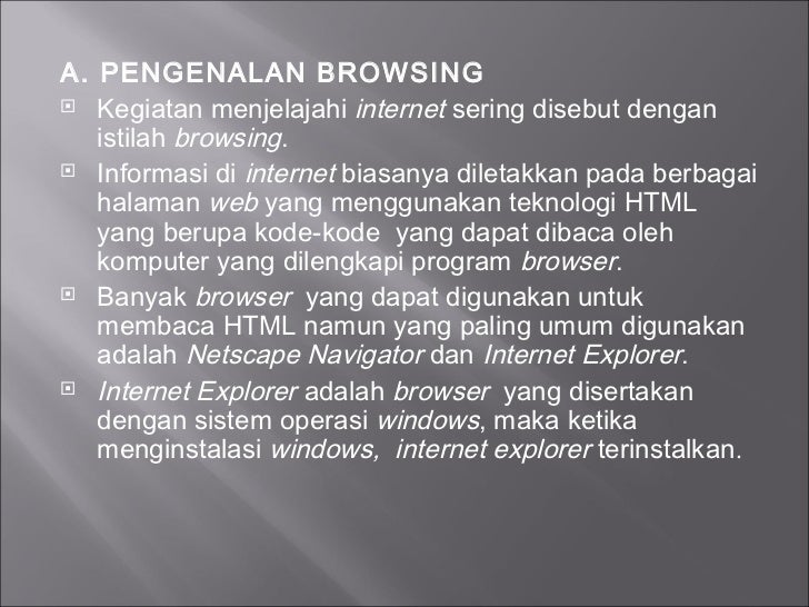 - 2. A. PENGENALAN BROWSING Kegiatan menjelajahi internet sering disebut dengan istilah browsing. Informasi di internet biasanya diletakkan pada berbagai halaman web yang menggunakan teknologi HTML yang berupa kode-kode yang dapat dibaca oleh komputer yang dilengkapi program browser. Banyak browser yang dapat digunakan untuk membaca HTML namun yang paling umum digunakan adalah Netscape Navigator dan Internet Explorer. Internet Explorer adalah browser yang disertakan dengan sistem operasi windows, maka ketika menginstalasi windows, internet explorer terinstalkan.