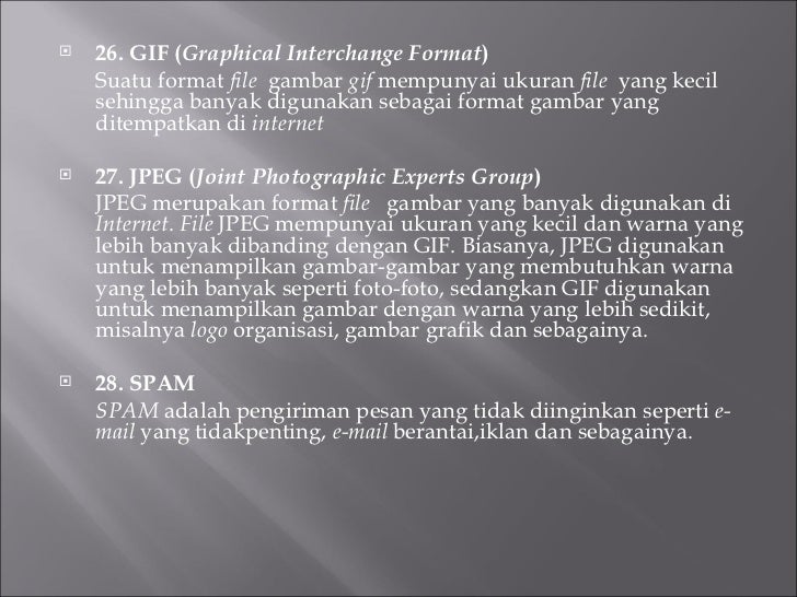 - 20. 26. GIF (Graphical Interchange Format) Suatu format file gambar gif mempunyai ukuran file yang kecil sehingga banyak digunakan sebagai format gambar yang ditempatkan di internet 27. JPEG (Joint Photographic Experts Group) JPEG merupakan format file gambar yang banyak digunakan di Internet. File JPEG mempunyai ukuran yang kecil dan warna yang lebih banyak dibanding dengan GIF. Biasanya, JPEG digunakan untuk menampilkan gambar-gambar yang membutuhkan warna yang lebih banyak seperti foto-foto, sedangkan GIF digunakan untuk menampilkan gambar dengan warna yang lebih sedikit, misalnya logo organisasi, gambar grafik dan sebagainya. 28. SPAM SPAM adalah pengiriman pesan yang tidak diinginkan seperti e- mail yang tidakpenting, e-mail berantai,iklan dan sebagainya.
