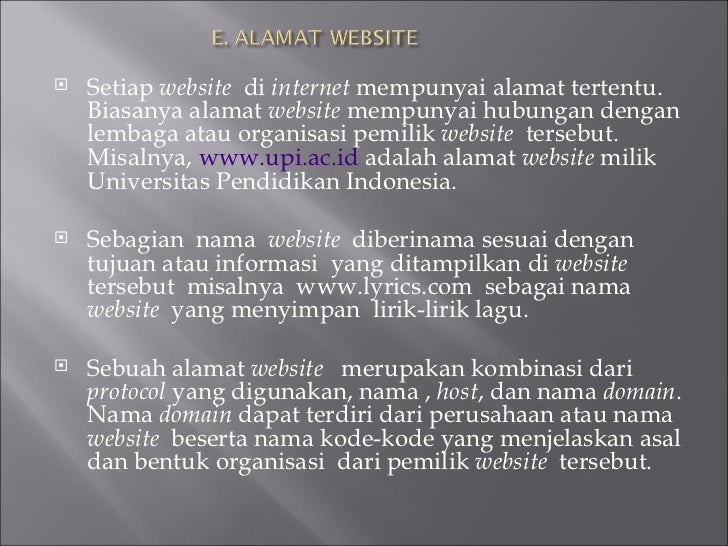 - 21. Setiap website di internet mempunyai alamat tertentu. Biasanya alamat website mempunyai hubungan dengan lembaga atau organisasi pemilik website tersebut. Misalnya, www.upi.ac.id adalah alamat website milik Universitas Pendidikan Indonesia. Sebagian nama website diberinama sesuai dengan tujuan atau informasi yang ditampilkan di website tersebut misalnya www.lyrics.com sebagai nama website yang menyimpan lirik-lirik lagu. Sebuah alamat website merupakan kombinasi dari protocol yang digunakan, nama , host, dan nama domain. Nama domain dapat terdiri dari perusahaan atau nama website beserta nama kode-kode yang menjelaskan asal dan bentuk organisasi dari pemilik website tersebut.