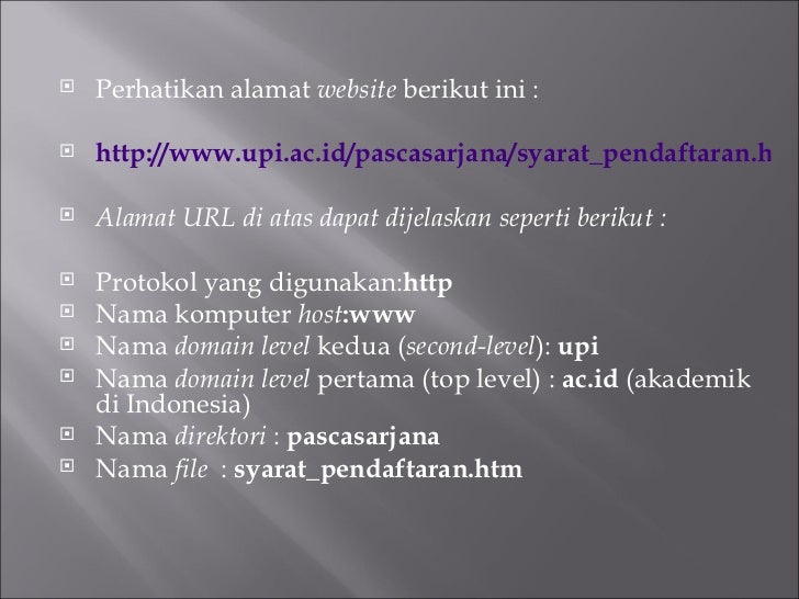 - 22. Perhatikan alamat website berikut ini : http://www.upi.ac.id/pascasarjana/syarat_pendaftaran.htm Alamat URL di atas dapat dijelaskan seperti berikut : Protokol yang digunakan:http Nama komputer host:www Nama domain level kedua (second-level): upi Nama domain level pertama (top level) : ac.id (akademik di Indonesia) Nama direktori : pascasarjana Nama file : syarat_pendaftaran.htm