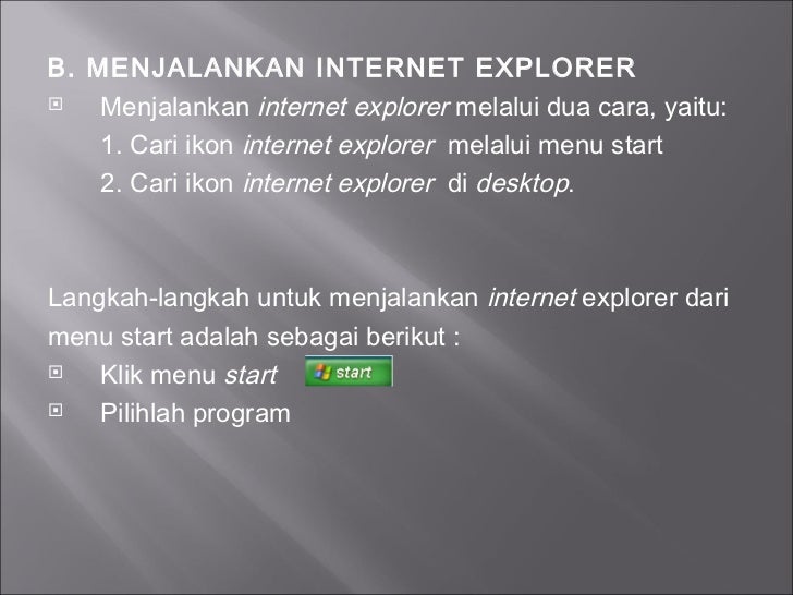 - 3. B. MENJALANKAN INTERNET EXPLORER Menjalankan internet explorer melalui dua cara, yaitu: 1. Cari ikon internet explorer melalui menu start 2. Cari ikon internet explorer di desktop.Langkah-langkah untuk menjalankan internet explorer darimenu start adalah sebagai berikut : Klik menu start Pilihlah program
