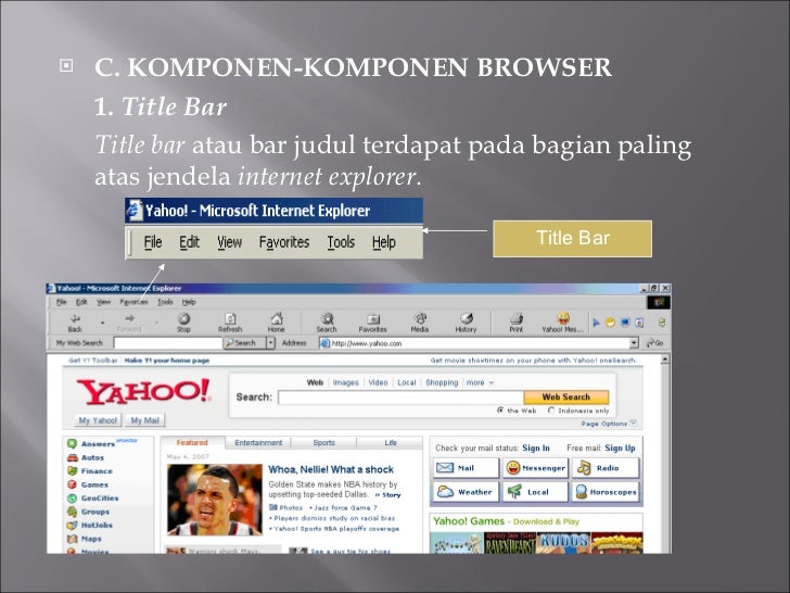 - 5. C. KOMPONEN-KOMPONEN BROWSER 1. Title Bar Title bar atau bar judul terdapat pada bagian paling atas jendela internet explorer. Title Bar