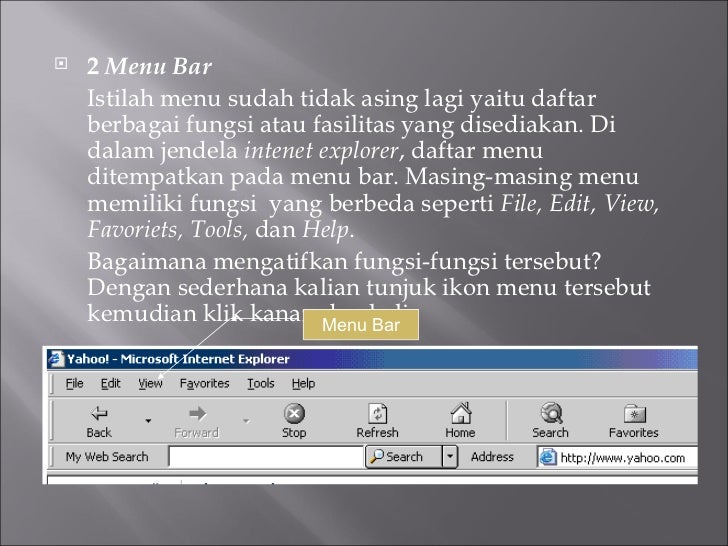 - 6. 2 Menu Bar Istilah menu sudah tidak asing lagi yaitu daftar berbagai fungsi atau fasilitas yang disediakan. Di dalam jendela intenet explorer, daftar menu ditempatkan pada menu bar. Masing-masing menu memiliki fungsi yang berbeda seperti File, Edit, View, Favoriets, Tools, dan Help. Bagaimana mengatifkan fungsi-fungsi tersebut? Dengan sederhana kalian tunjuk ikon menu tersebut kemudian klik kanan Menu kali. dua Bar